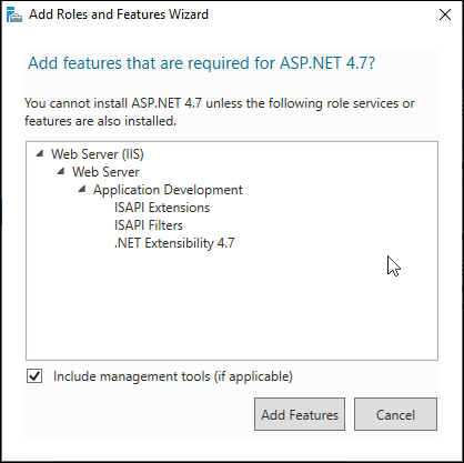 d. This opens a dialog box asking you to confirm adding additional features that must be installed for ASP.Net 4.7 or ASP.Net 4.8.