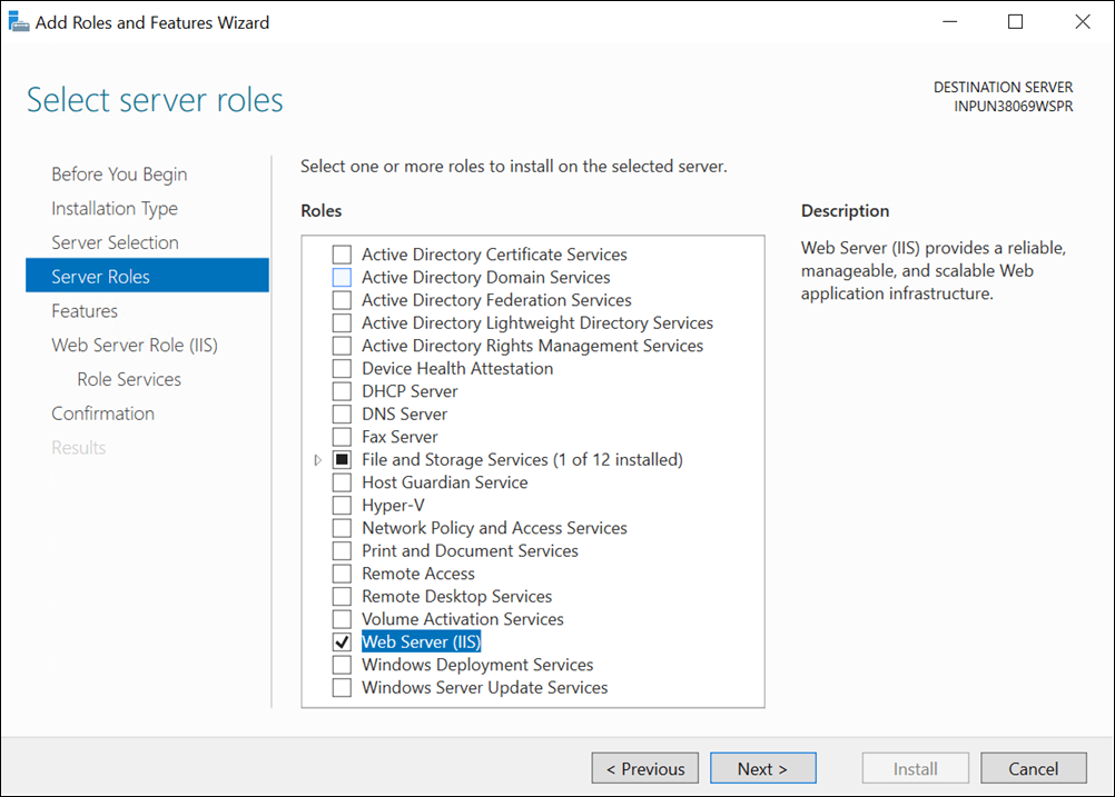 - In the Add Roles and Features Wizard dialog box, click Next until Server Roles is selected.