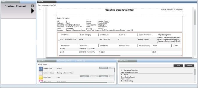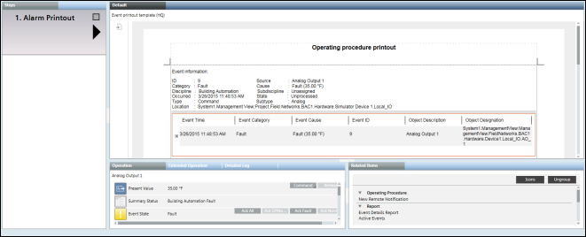 2. An Alarm step is added to the operating procedure template and an Event Details report is associated with the step.