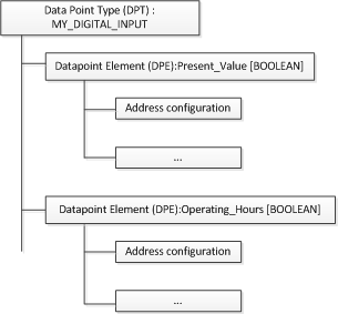 The data object type is called a data point type. An element within this type is termed as a property. (This is also called data point element or DPE). Additionally, the property must be specified with a corresponding address on the field device. This is called the address configuration of the property. Finally, a data object which is an instance of the data point is called a data point instance (DPI).