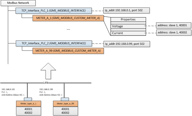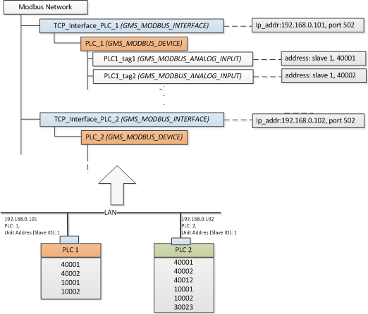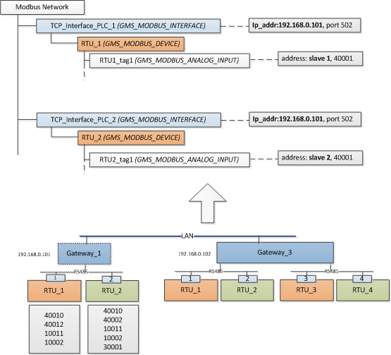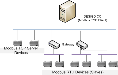 Each Modbus TCP device is represented by a unique combination of two objects; the TCP interface and the device. This may look counter-intuitive since, physically, the device and its communication interface as one entity. However, the logical separation of the communication interface and the device enables modeling of Modbus devices, which are integrated using a gateway device. In this case, each Modbus device does not have a physical TCP interface. The Modbus client sends the request to the IP address of the gateway, along with the slave address of the Modbus RS485 device. The gateway then uses classical Modbus protocol to query the slave device, obtain the response, and forward it as Modbus TCP response back to the Modbus client.