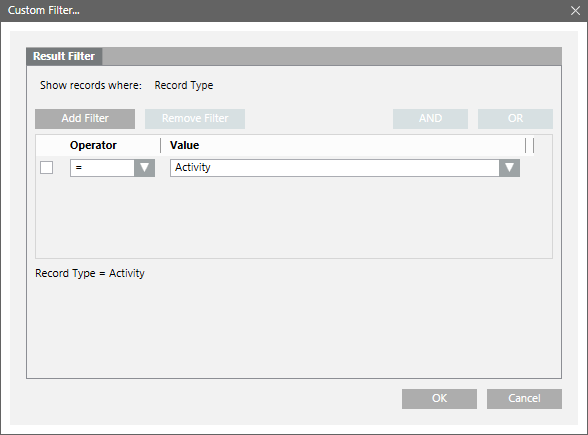 If you apply a Result Filter on a column with an existing result filter, the new filter condition replaces the older condition. In order to apply Result Filter on Previous Value and Value column, enclose the value entered in the Value text field within double quotes, if it is in the 2E63 to 2E64-1 range. In the absence of Show rights, the Value drop-down list displays all the corresponding event categories when you apply a Result Filter on the Event Category column. The records of only those event categories display whose Show rights have been granted, after a Result Filter is applied on the Event Category column.