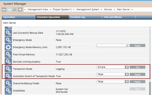The Transaction Mode is a property of the Main Server. It sets how data is written to the project database. Its value during normal operation is Logging