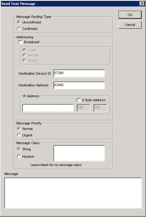 Unconfirmed | Click this button to send an unconfirmed text message to a device or devices. Unconfirmed messages can also be broadcast to the local subnet, a remote subnet, or globally. |