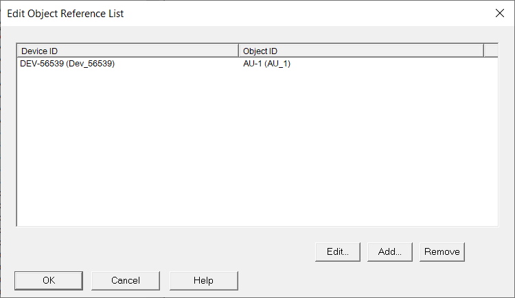 The Add/Remove List Element dialog box allows you to add list elements to an object in a device or remove list elements from an object in a device. The BACnet Object Browser only allows editing of simple data type lists.