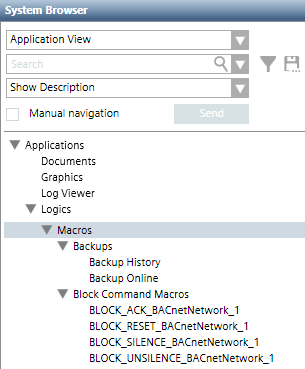 If you need to change the System Browser view to find the target object/scope, select the Manual navigation check box first. This will let you switch to a different view (for example, Management View) while still retaining the Macro tab.