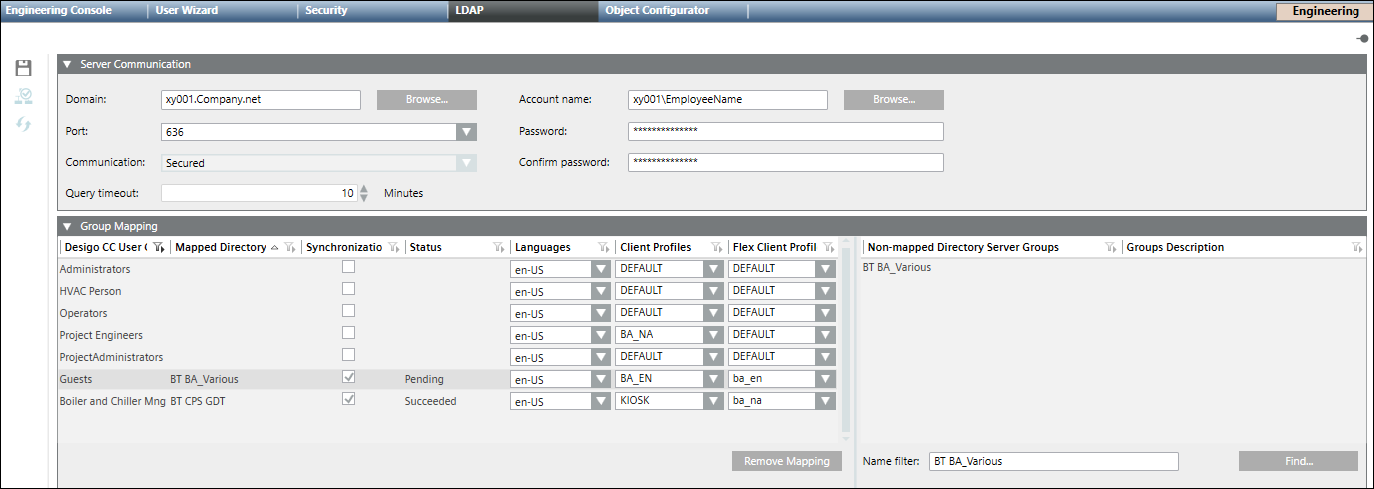 The Lightweight Directory Access Protocol LDAP is a directory information service based on the TCP/IP protocol. LDAP refers to the communication between the client and the LDAP server. All personal data of an organizational unit are managed on the LDAP server and can be transferred to Desigo CC as a user group if required.