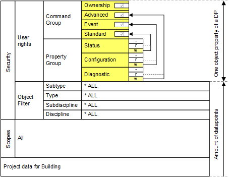 Access rights to an object in Desigo CC depend on various factors. You do not need to define Scopes if you want to assign full access rights to a user group. To operate and monitor, you must assign write rights for the property group and enable the command group. The following diagram illustrates full access rights: