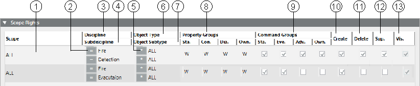 Scopes (see Scopes) are used in various applications such as Journaling, Notifications, and macros, to define display and operation. In Security, Scopes are used to configure access rights for a group. You can assign several Scopes to a group, which allows you to configure different rights on a Scope for different filter settings, such as Discipline, Subdiscipline, Object Type or Object Subtype.
