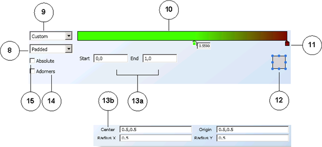 13b | Radial Gradient Control Enter explicit values to define the radial gradient Center, Origin, Radius X, and Radius Y positions. NOTE: To prevent any unexpected differences in the Flex client, it is recommended you use the same value for radius X and Y when configuring your graphics. For more information, see Brush View and Brushes Group. |