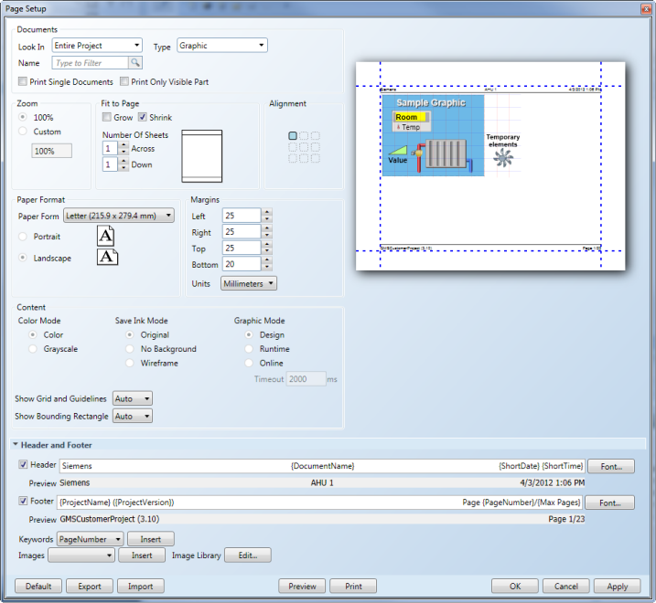 Preview | Display the text and substituted keywords that will display in the header/footer. NOTE: Images are not displayed in the preview filed. The substituted keywords show the final text, when possible. Some keywords are updated during the print process. | |