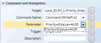 After dragging a property form the Extended Operations tab or System Browser to the Target property in the Command and Navigation property tab in the Graphics Editor, the drop-down is filled with commands that have been defined in the library for that object model. The commands are then displayed in the format: Label[Name].