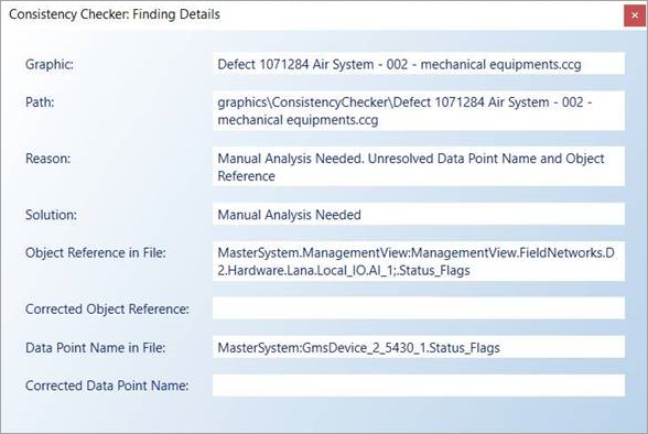 When you run the task, the Consistency Checker, by default, scans through all the .CCG files stored in the projects folder: [Installation Drive]:\[Installation Folder]\[Project Name]\graphics and compares the Data Point Name and the Object Reference values in the file against the values saved in the database. If any inconsistencies found are then displayed in the Findings section of the tool.