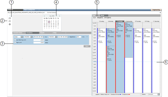 Schedules consist of a name and description, a toolbar for working with the schedule, a date picker, several tabs (Schedule Entries, Outputs, Exceptions, and Setup), daily and weekly views, and schedule details.