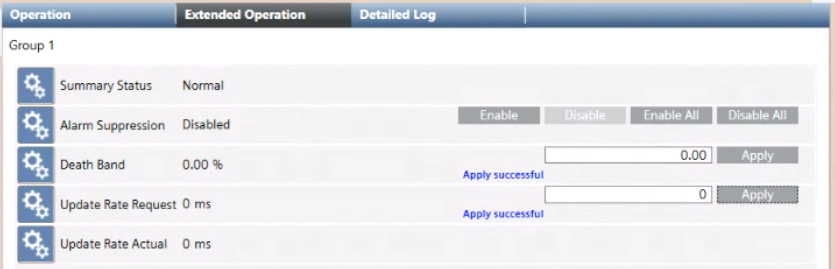 When you select an OPC group, the Extended Operation tab displays its properties and commands.