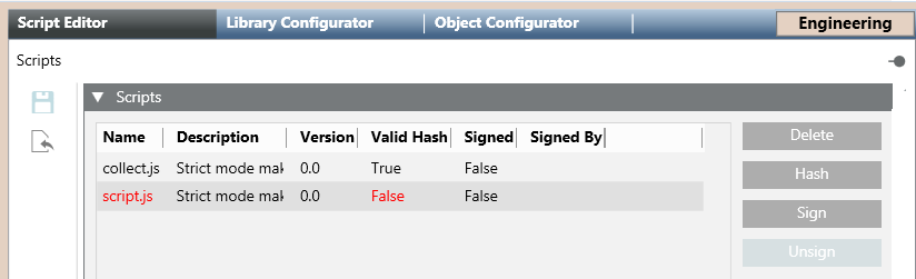 Each script in the list is identified by name, description, version, and indications of whether the script is signed, has a valid hash, or is protected: Here you can add or remove scripts from the library, as well as hash, sign, unsign, or protect the scripts.