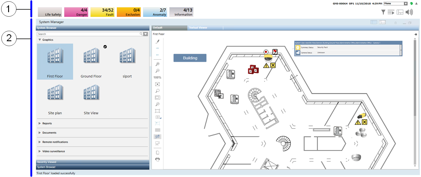 In the example below, the Summary bar is expanded and System Manager shows a graphical view of a floor plan.