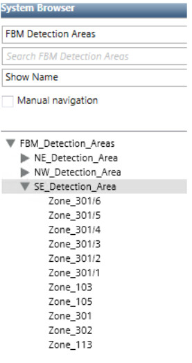 This is a user-defined view in which you create a folder corresponding to each detection area that you want to show, and under each of these folders add the corresponding fire objects. For example, the below view contains folders for three detection areas, NE, NW, and SE. Under each folder are drag-and-dropped the corresponding fire zones.