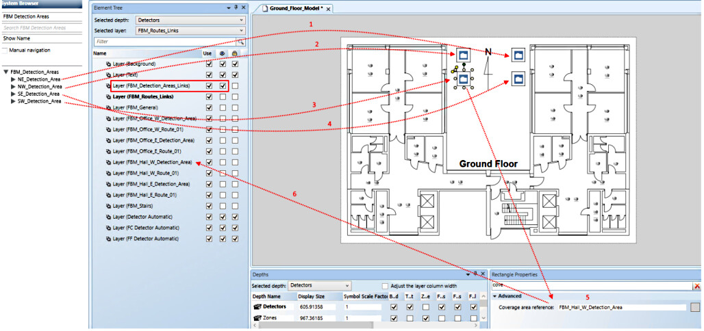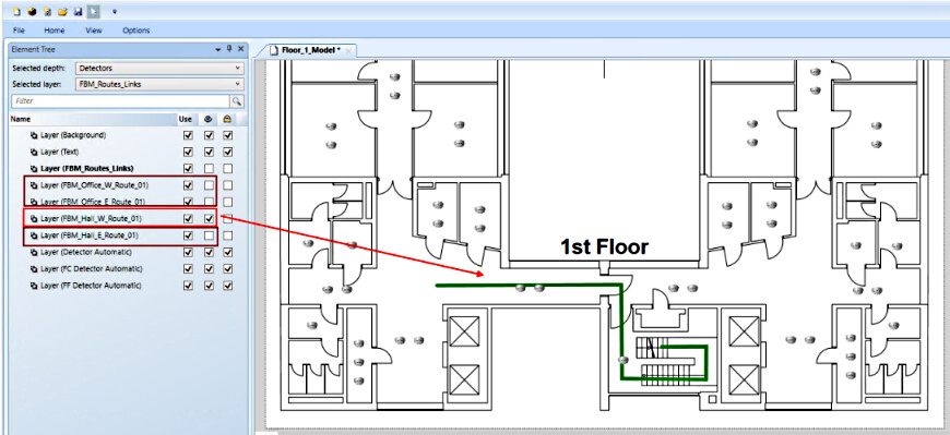 2. Now on the graphic of each floor, also create a layer to link the above access/evacuation routes with the corresponding detectors: