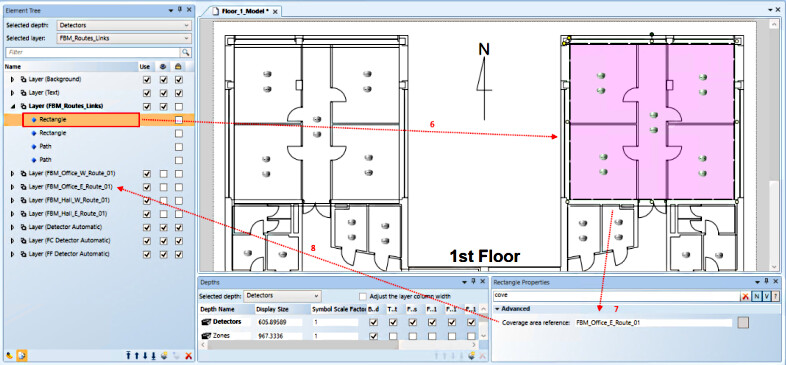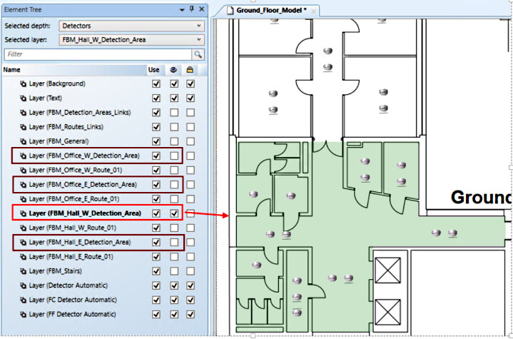 2. Now, still in the ground floor graphic, create a layer to link the folders of the previously created user-defined view with the corresponding detection areas: