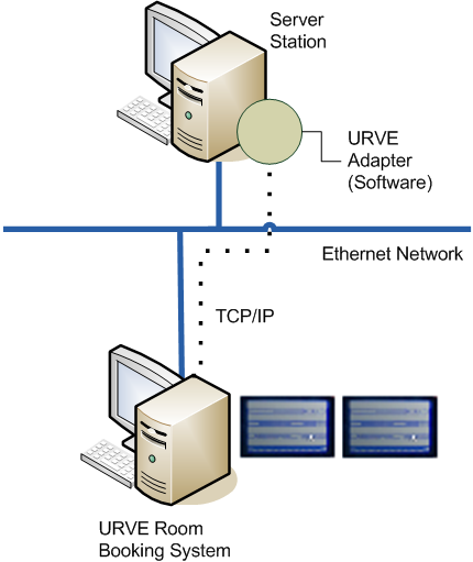 The URVE Room Booking system can communicate with the management station over an Ethernet network via a software adapter typically installed on the management station.