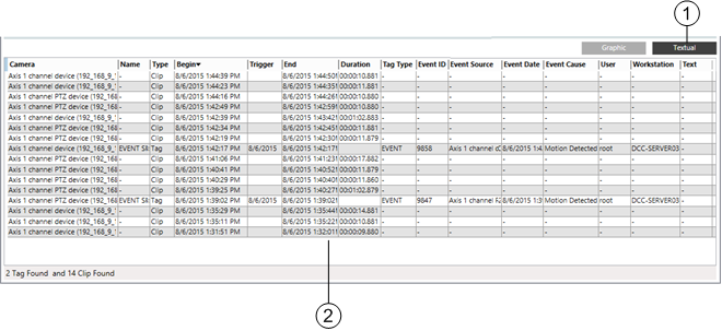 The results of the search display in the timeline section at the bottom of the Video Archive tab. The timeline shows recordings and tags that match the query definition. As in the Timeline in the Contextual pane, you can analyze the query results in both graphical and textual mode.
