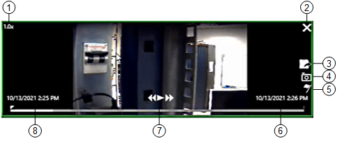 Monitors that are playing back recorded video are highlighted with a green border. When you hover the mouse over the monitor, playback controls become available.