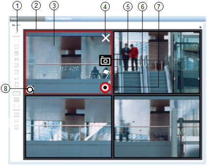 Displays the live video images acquired from a camera. The monitor corresponding to the currently selected camera is highlighted with a red frame.