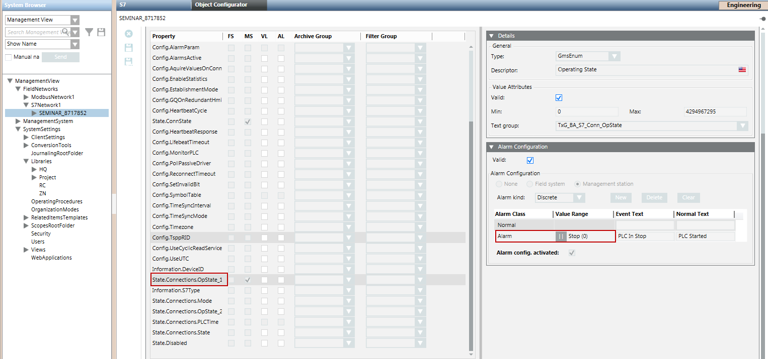 You can configure alarms for S7 devices from the State.Connections.OpState_1 property.