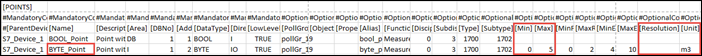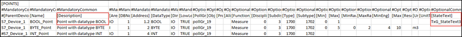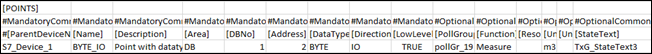 To represent more than two states, you must configure the StateText attribute of a multi state point. In the CSV file example shown below, the textgroup with name TxG_StateText3 has been assigned to the BYTE_IO point.