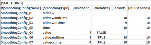 oldnewandtime - Value of a point is recorded on the management station only when there is a change in the value of the point on the device and it exceeds the tolerance time specified in the [Seconds] and [Milliseconds] fields in the CSV. For example, an integer point with 100 as present value and 10 seconds as the tolerance time, will pass smoothing only when there is a change in the value of the point on the device and after completion of the tolerance time of 10 seconds.