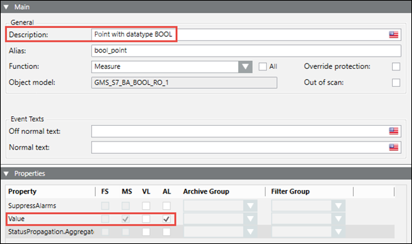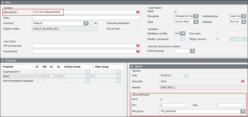 Since a Boolean point can have a maximum of two states, the text group also has two states. These two states correspond to the two value range of Minimum and Maximum. After the CSV import, the Details expander displays as follows:
