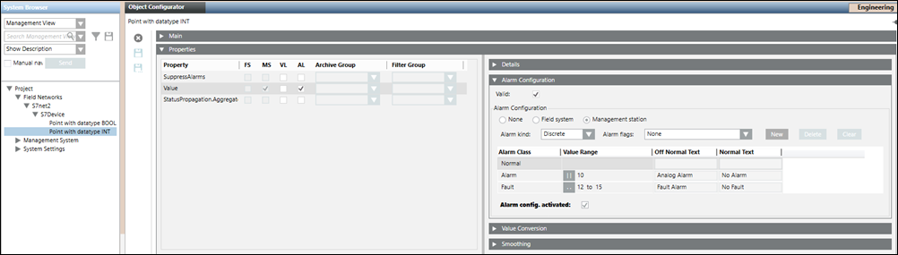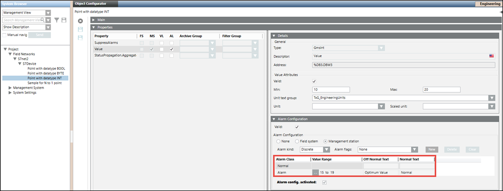 After the import of the above CSV, the alarm configuration looks like this.