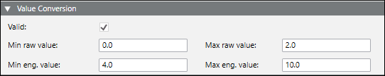 The Min Raw, Max Raw, Min Eng, and Max Eng data in the CSV can be configured as follows:
