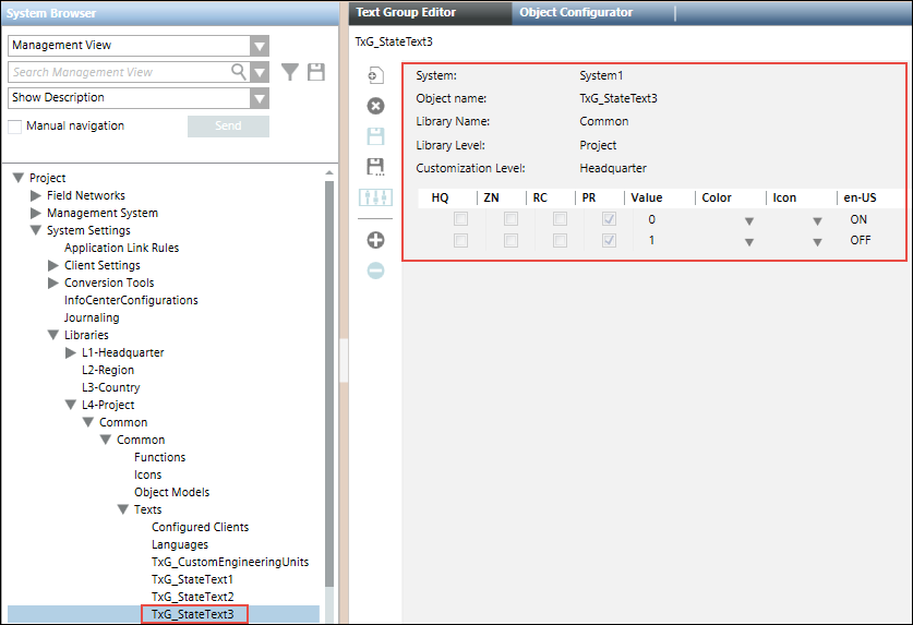 After importing the CSV for such a point, its text group is also added to the list of text groups. The following image displays the Text Group Editor showing the three state texts.