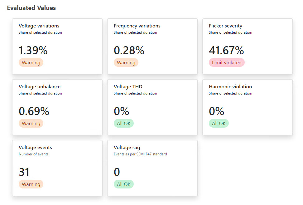 This report displays the total power quality variations occurred over selected time period. The data can be displayed as same as flex client which is combination of timeline chart, donut chart, tables, ITI CBEMA, and SEMI F47 standard.
