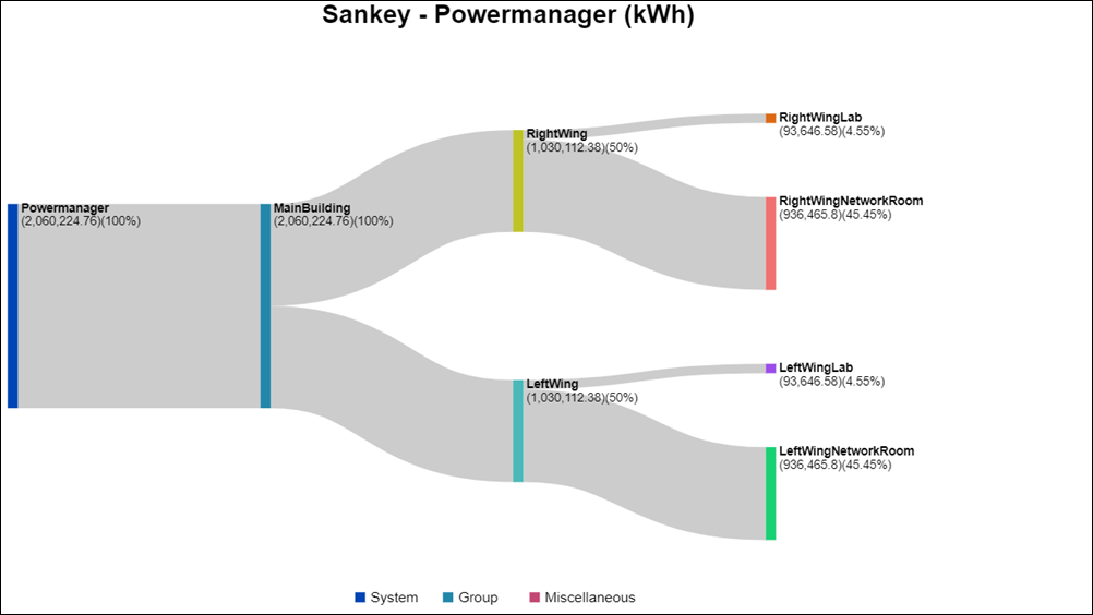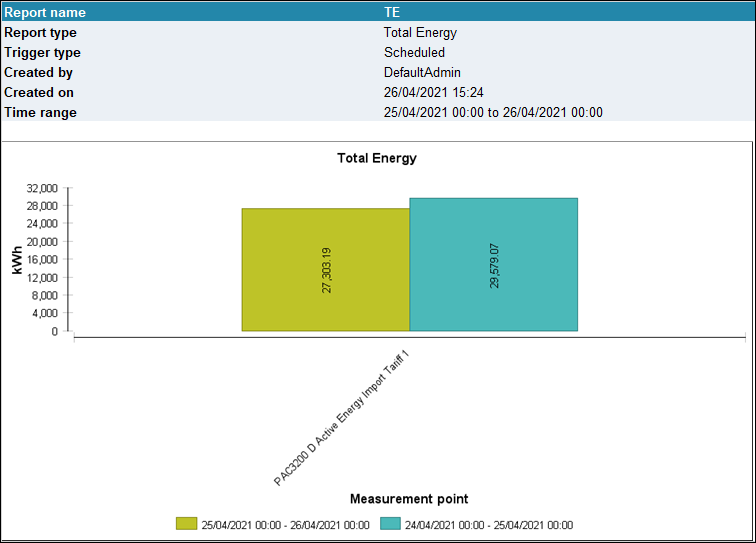This report displays the total energy consumption of a selected data point for the selected time period. The data can be displayed as a bar chart or a pie chart.