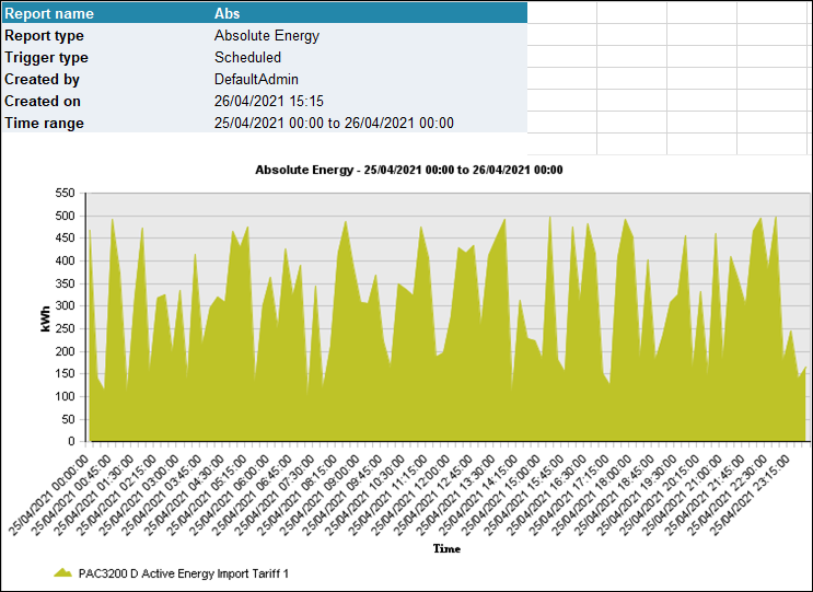 This report gives an overview of the absolute energy consumption of the data points for the selected time intervals. It shows the data point which has the most influence on the total energy consumption. The report can be created with a bar chart or an area chart.
