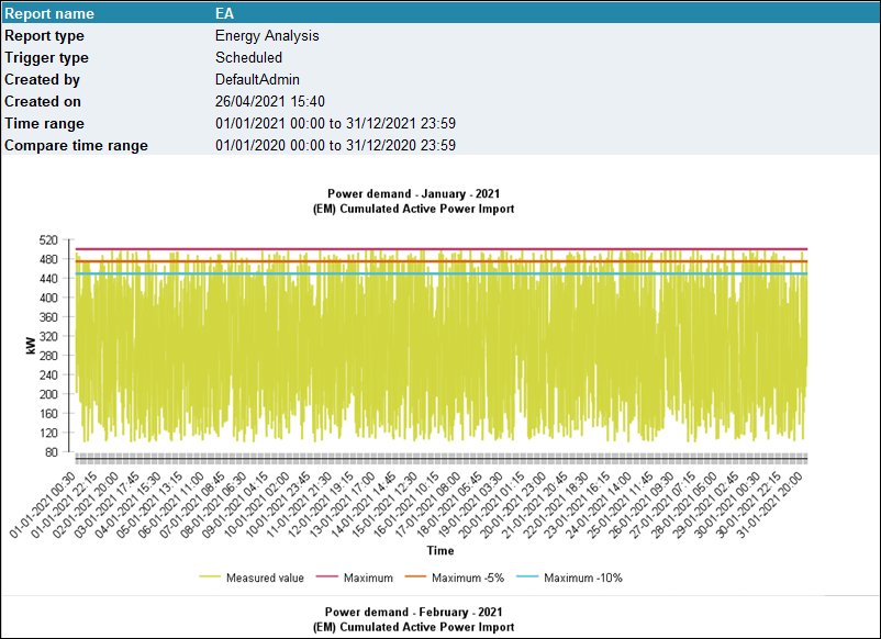This report analyzes the energy consumption and the corresponding power demand value for a time period of one or two years. It gives an overview of the power demand curves for the year and each month. Only the completed month have charts and its data for the current year. Also, the report shows the energy consumption value of each month and the corresponding power demand peak value.