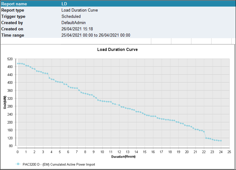 This report displays the power demand values and the duration of each power demand value used in the selected time period. It displays a detailed view of the 50 highest power demand values of the selected time interval and an analysis of these values over the day.
