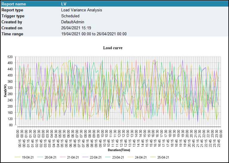 This report shows the power demand values for the selected time period and shows the range of the power demand values for each time. On this basis, it displays the variance of the load for a certain time period.