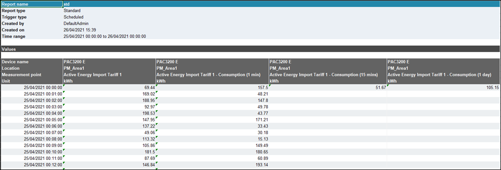 This report can be used for any powermanager measuring value that is archived. This report displays all the values of the selected data points for a selected time period in a table.