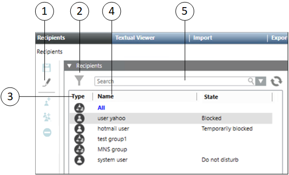 Displays the icons for operations such as Save configuration, Add User, Add Group, , Remove, Import File, Import Recipients from Active Directory, and Export File.