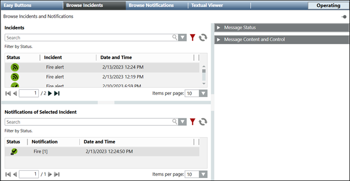 The Browse Incidents tab displays in Operating mode when you select Applications > Notification in the Application View from the System Browser.