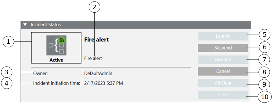 - Incident Status: Displays the status of the initiated incident and other details like type, owner, and incident initiation time. The Incident Status expander also displays options for suspending, resuming, canceling, and closing an initiated incident.