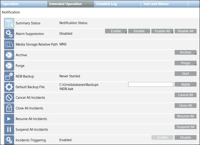 You can also control all configured incidents in the system using the Cancel All, Close All, Resume All, Suspend All, and Incident Triggering commands from the Extended Operation tab by selecting the Notification node in the System Browser.