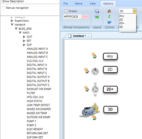 Styles include 2D, 2D+, 3D, or you can create a custom Style. A new Symbol Style can be created to meet Zone, Regional Company (RC), or project requirements. One Symbol in each Symbol group of a particular style is set as the Default Symbol.