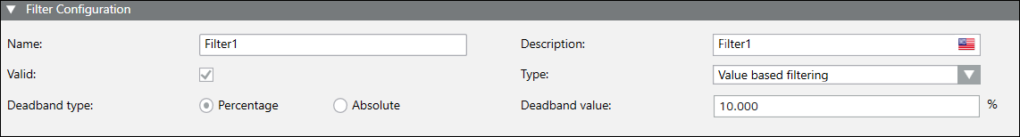 Checked, by default. Uncheck the Valid check box to disable the filter group. Once disabled, even if this filter group is assigned to any property, the COVs are not filtered according to the filter group definition. Only repeating values are filtered.