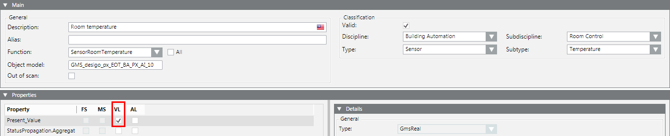 a. Select the property you want to log (for example, Present_Value) and select the VL check box alongside it.