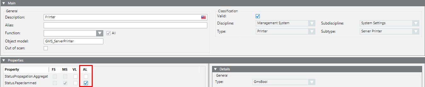 3. In the Properties expander, select the property you want to log (for example, Status.PaperJammed) and select the AL check box.
